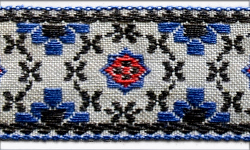 1" wide woven cotton ribbon in a design of wreaths of black leaves, enclosing polygon stars and on a white background. 100% cotton.