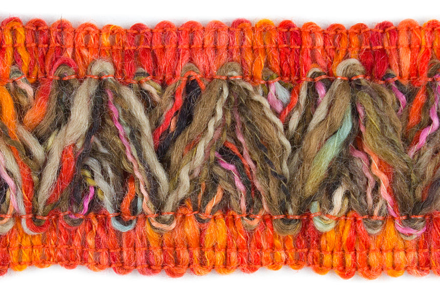 2 1/2" wide braided trim in shades of pumpkin and toast, with a hint of pink and green. This trim is perfect for sewing haute couture garments such as French designer-inspired jackets - layer your trims for a unique and special look! 100% wool.