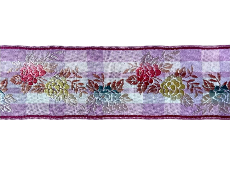 2" pink, lilac, and ivory plaid woven ribbon embroidered with branches of ombré lemon yellow, cherry red, and teal flowers. Made in France.