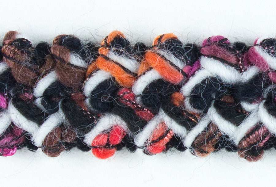 3/4" wide braided trim in black and white, with sherbet shades of tangerine, pink, and chocolate accents. This trim is perfect for sewing haute couture garments such as French designer-inspired jackets - layer your trims for a unique and special look! Wool blend. Made in France.