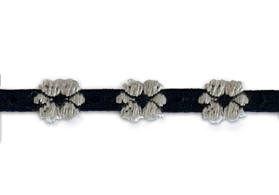 3/8" wide trim with pale cream floral rosettes on a black ribbon. This trim is perfect for sewing haute couture garments such as French designer-inspired jackets - layer your trims for a unique and special look!