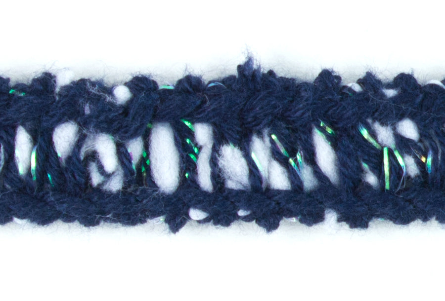 5/8" wide braided trim in navy blue and white, with clear iridescent accents. This trim is perfect for sewing haute couture garments such as French designer-inspired jackets - layer your trims for a unique and special look! (Made in France)