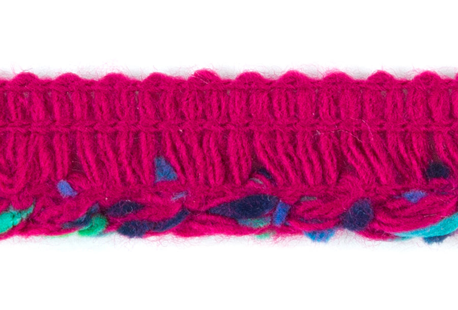 5/8" wide braided trim in deep pink, with sea-foam green, turquoise, and navy blue accents. This trim is perfect for sewing haute couture garments such as French designer-inspired jackets - layer your trims for a unique and special look! (Made in France)