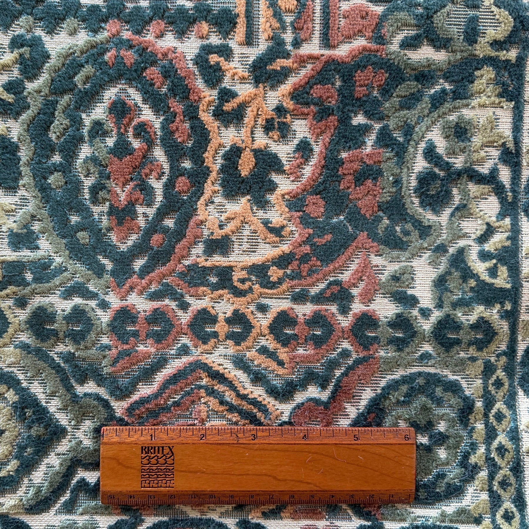 A viscose blend velvet tapestry in a paisley kilim design in shades of apricot, teal, rust, and artichoke on a natural background - this lush upholstery fabric is perfect for sofas, chairs, ottomans and headboards. Made in Belgium. 51% polyester, 47% viscose, and 2% cotton. 57" wide.