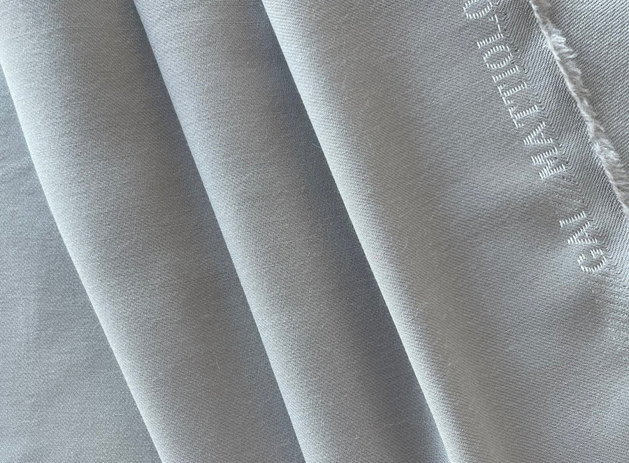 A couture selvedged wool twill suiting in cool harbor grey - this drapey, luxurious woolen is perfect for travel garments, classic tailoring, chic palazzo pants, or a suit. Made in Italy and used by Armani. 100% wool. 60" wide.
