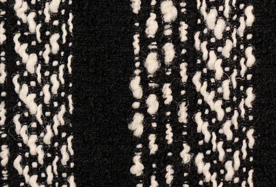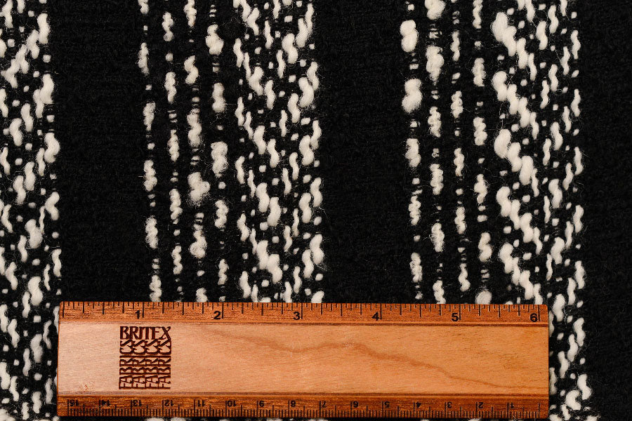 A coat-weight wool bouclé embellished with woven crosswise stripes in winter white on a black background - perfect for a casual barn coat or a warm lined vest. Made in Italy. 80% wool and 20% polyester. 60" wide.