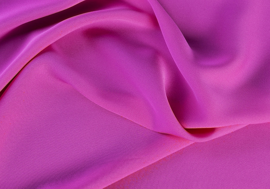 A blouse-weight stretch silk crepe in jeweled fuchsia - marvelous for a blouse or a chemise. 93% silk and 7% lycra blend. 43" wide.