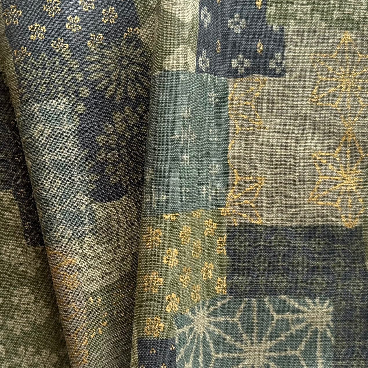 A homespun quilting cotton in a traditional boro patchwork print of in shades of soft greens and blue, with subtle gold metallic accents - this textured print is perfect for gift wrapping, full skirts, blouses, totes, napkins, or aprons. Made in Japan. 100% cotton. 44" wide.