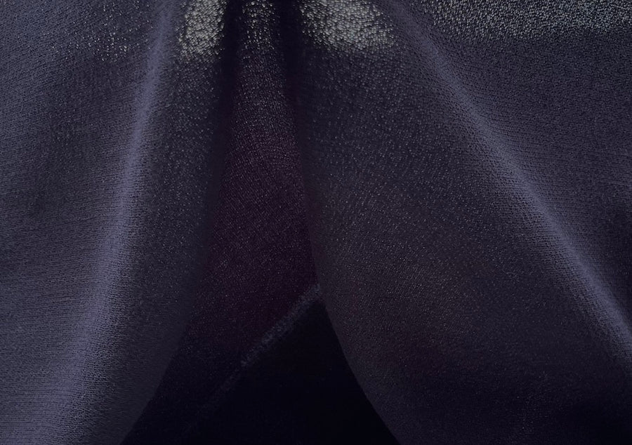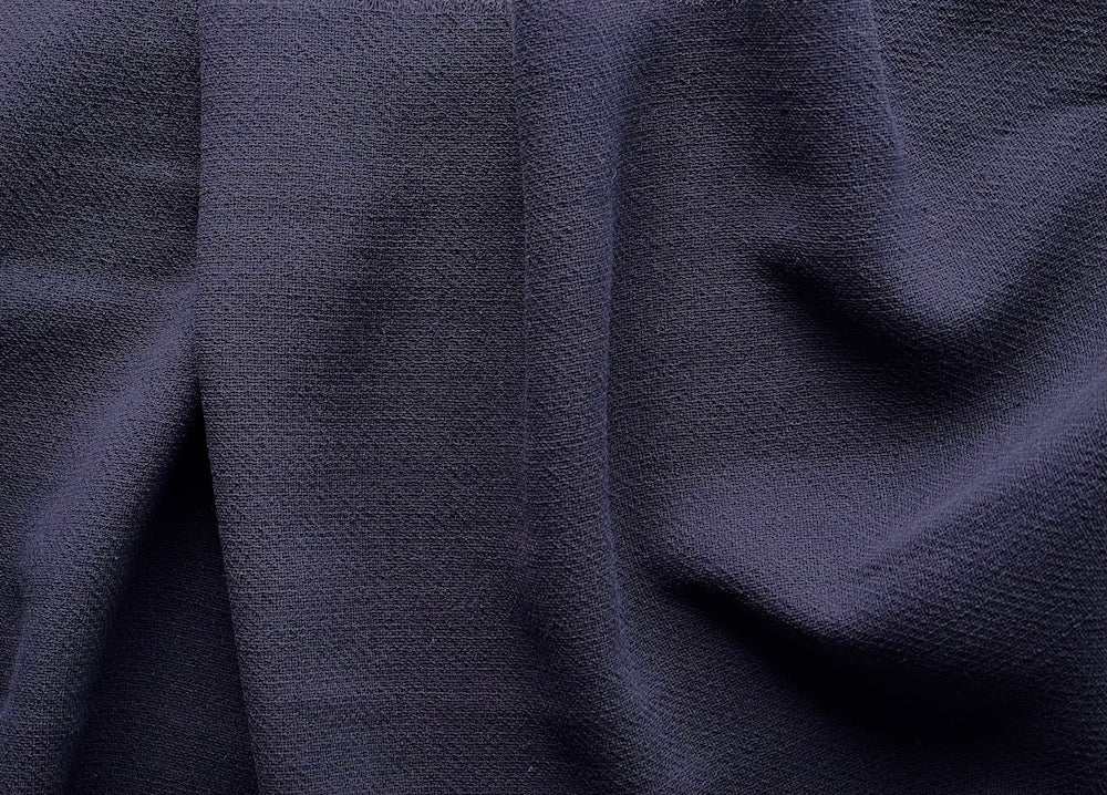 A semi-sheer wool crepe in inky navy blue - this uniquely woven, drapey wool crepe is perfect for tunics and blouses. Made in Italy and used by an iconic English company. 100% wool. 52" wide.