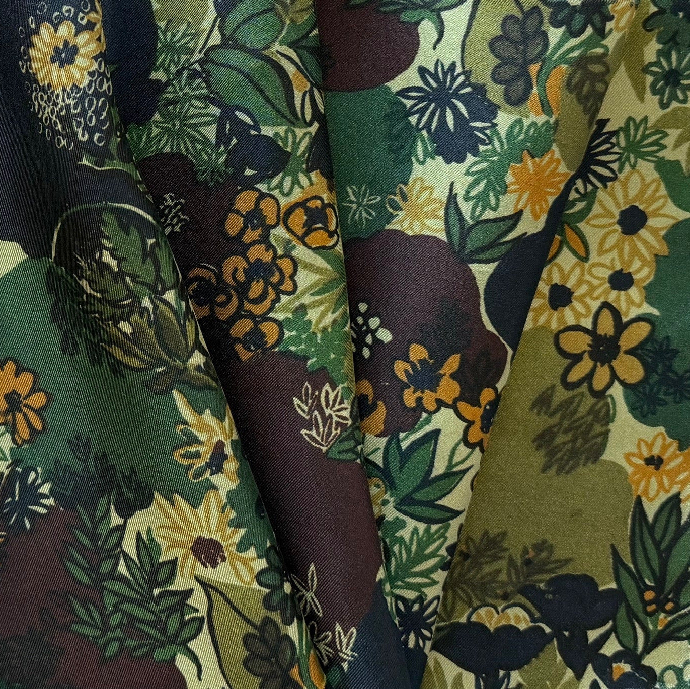 A mid-weight silk twill in a floral print with an cameo background in shades of hunter, mahogany, wine, olive, mustard, and sage  - this cool print is perfect for dresses, blouses, robes, or wide-legged pants. Made in Italy. 100% silk. 55" wide.