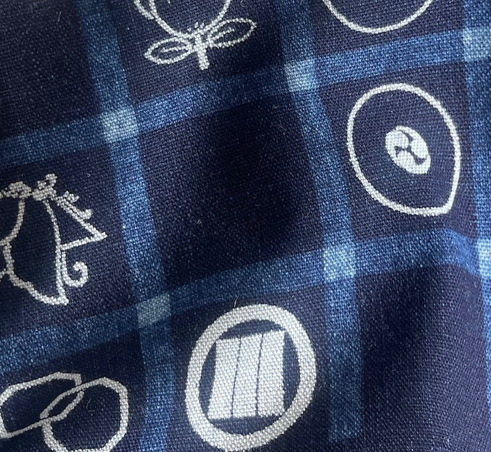 A traditional Japanese midweight indigo cotton fabric in a tone-on-tone and white checkered and objects pattern.