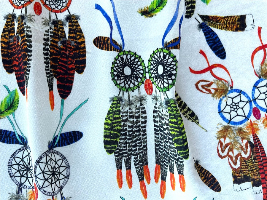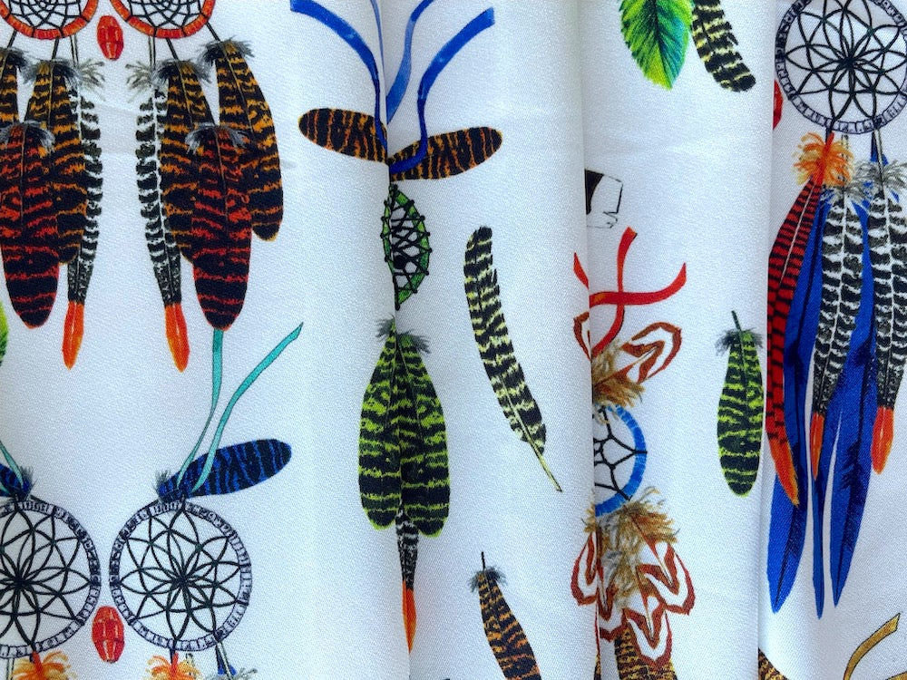 A designer stretch rayon viscose crepe in a print of brightly colored fantastical feathered dream catchers on a sparkling white background - this unique print is perfect for skirts, an elegant caftan, tunic top, or palazzo pants. Made in Italy. 100% rayon viscose. 56" wide.