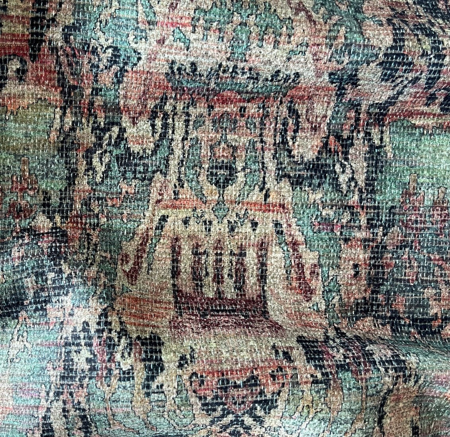 A rayon blend upholstery chenille velvet in a distressed pastel kilim design in shades of teal, sandy beige, apricot, and black - this plush, tightly woven upholstery fabric is perfect for sofas, chairs, ottomans and headboards. Made in Turkey. Rayon viscose and polyester. 55" wide.