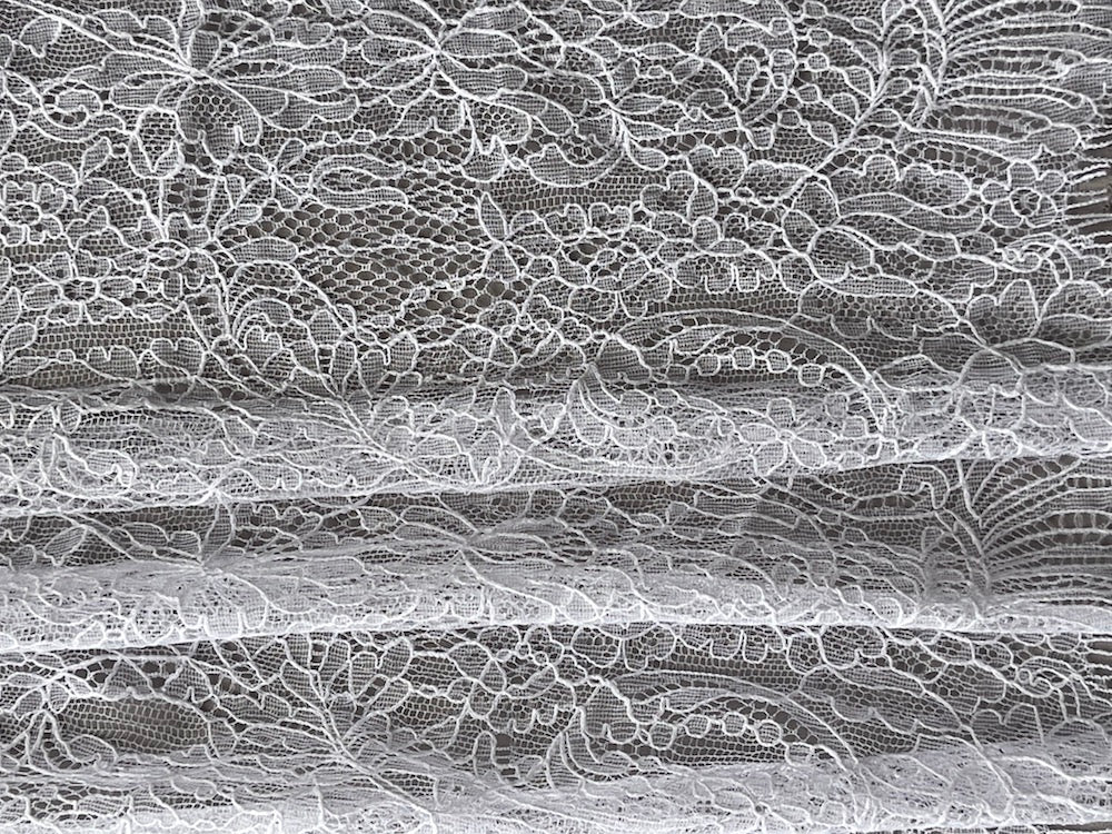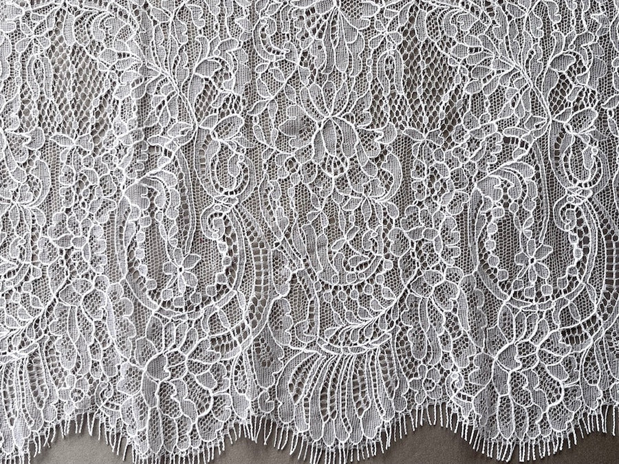 A delicate Chantilly lace fabric in brilliant white, with a stunning floral pattern and double scallops - soft, romantic, and drapey, this lace is perfect for special occasions, bridal wear, and lingerie. Made in USA. 55% poliamide and 45% rayon blend. 50" wide.
