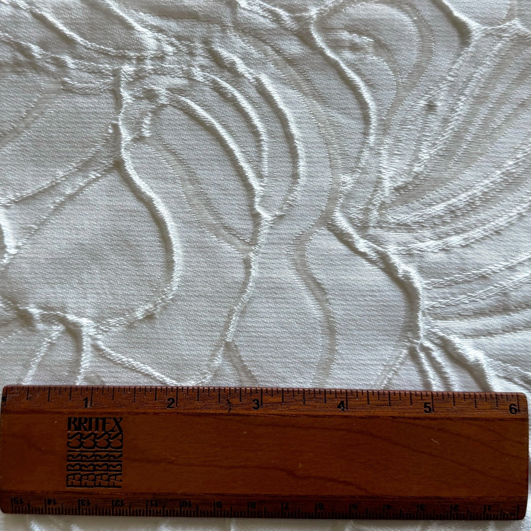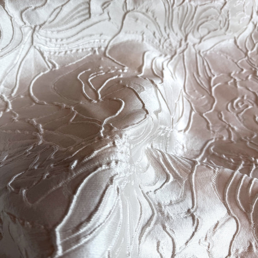A high-end, lighter-weight silk blend brocade in an off-white, all-over raised curvilinear design  - this couture-quality, sophisticated brocade has body, making it perfect for an incredible evening coat or gown. Made in Italy. 50% silk, 40% lurex, and 10% polyester. 55" wide.