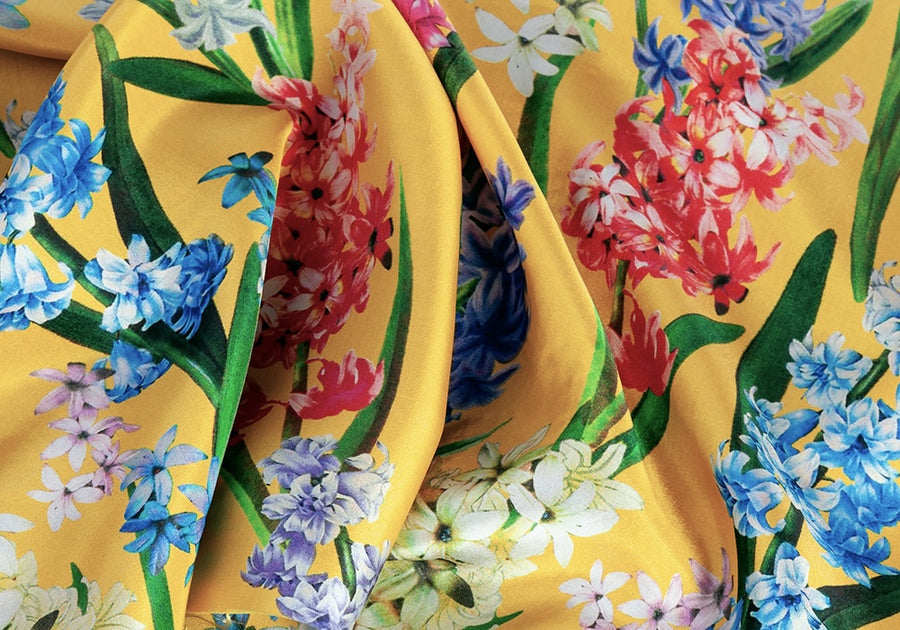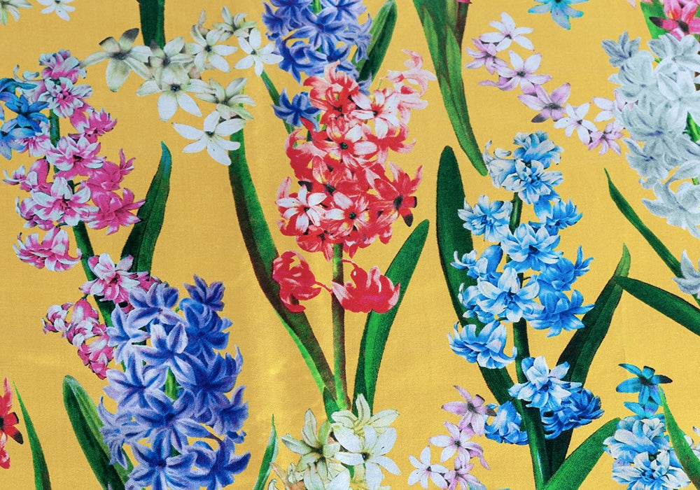 Fragrant Hyacinths on Gold Silk Crepe de ChineMade in Italy)