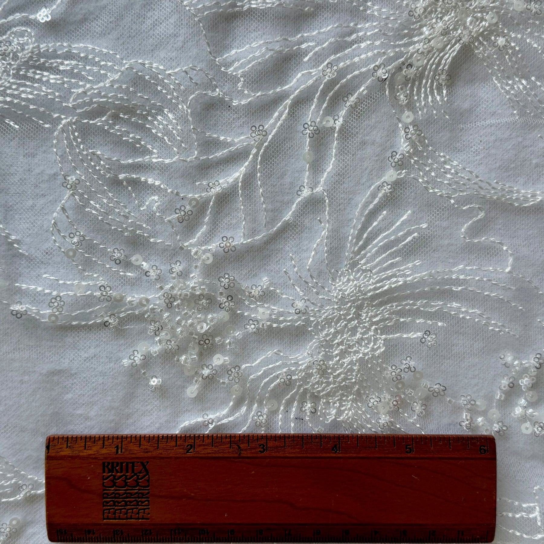 A pale ivory nylon mesh covered in subtle white embroidered flowers and adorned with white beads and sequins - this understated fabric is perfect for tunics, lounge-wear, or party dresses. Limited yardage. Made in Korea. 56" wide.