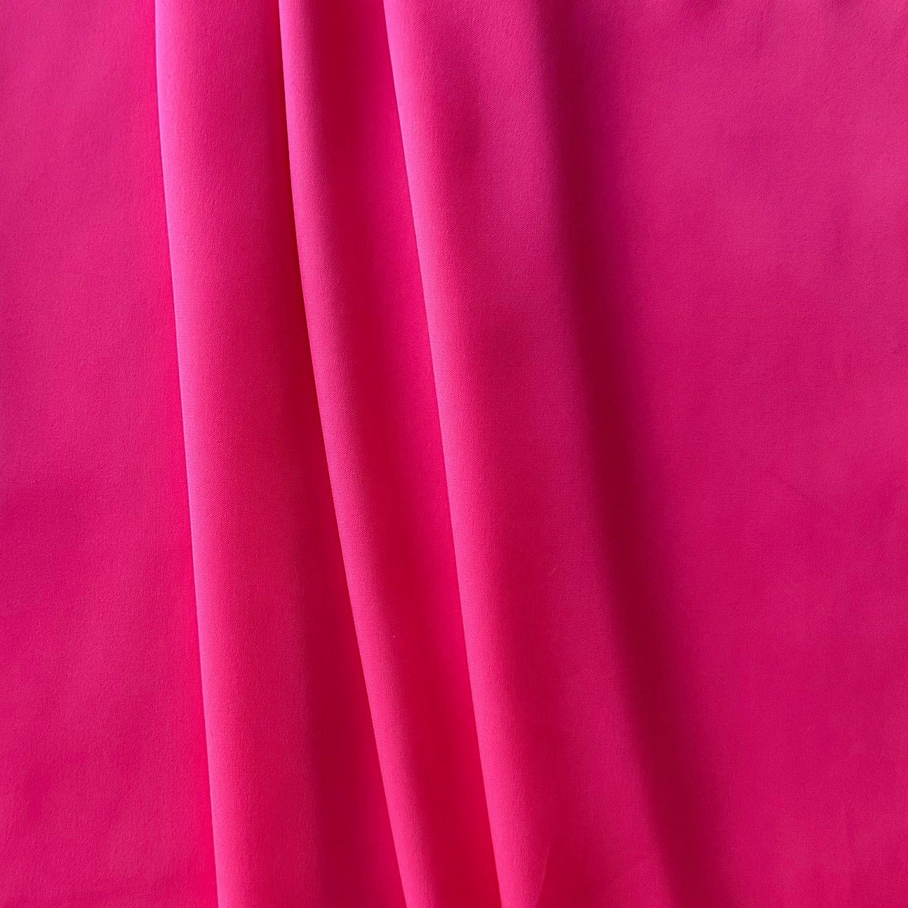 A gleaming, double-faced stretch silk satin charmeuse in fluorescent hot pink - with a hint of lycra, this fluid, tightly woven silk charmeuse has liquid drape and is perfect for blouses, lingerie, wrap tops, anything bias-cut, or lining. Made in Korea. 93% silk and 7% lycra. 54" wide.