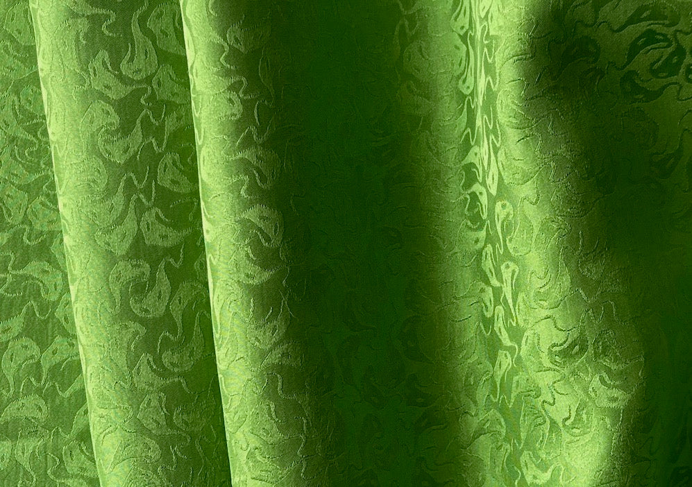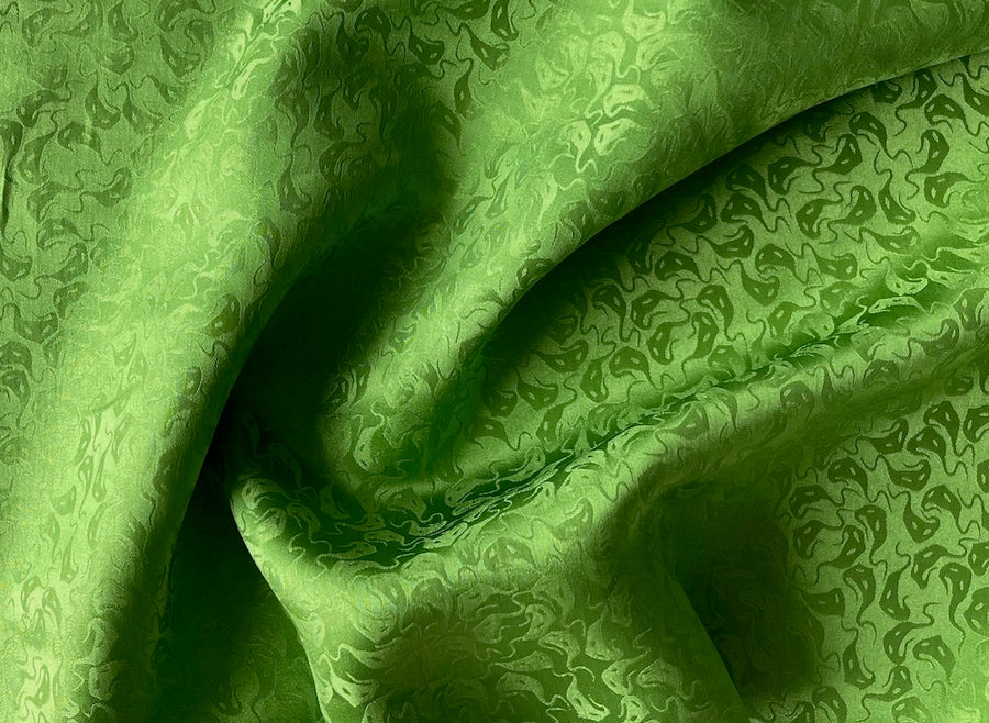 A gorgeous jacquard silk satin charmeuse in harlequin green with a jacquard design of scattered masquerade masks - this fluid silk jacquard is perfect for blouses, lingerie, or dresses. Made in Italy. 100% silk. 55" wide.