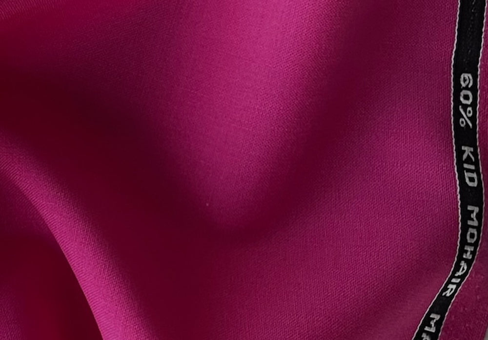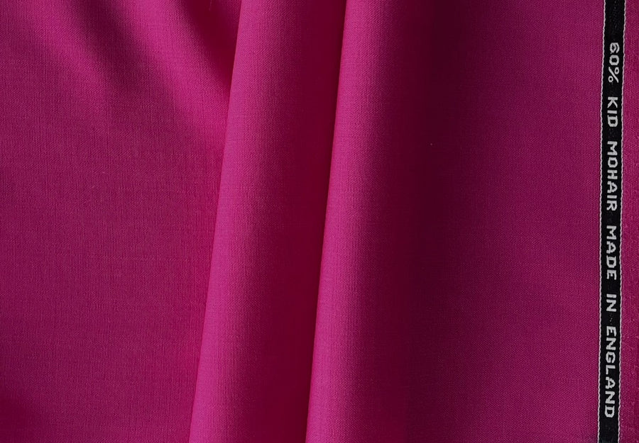 A high-end selvedged mohair and wool suiting in Barbie's French Magenta pink - this joyously colored, smooth, light-weight, high-end wool suiting is tightly-woven and perfect for travel garments, classic tailoring, slacks, or a stand-out suit. Made in England. 60% mohair and 40% wool. 61" wide.