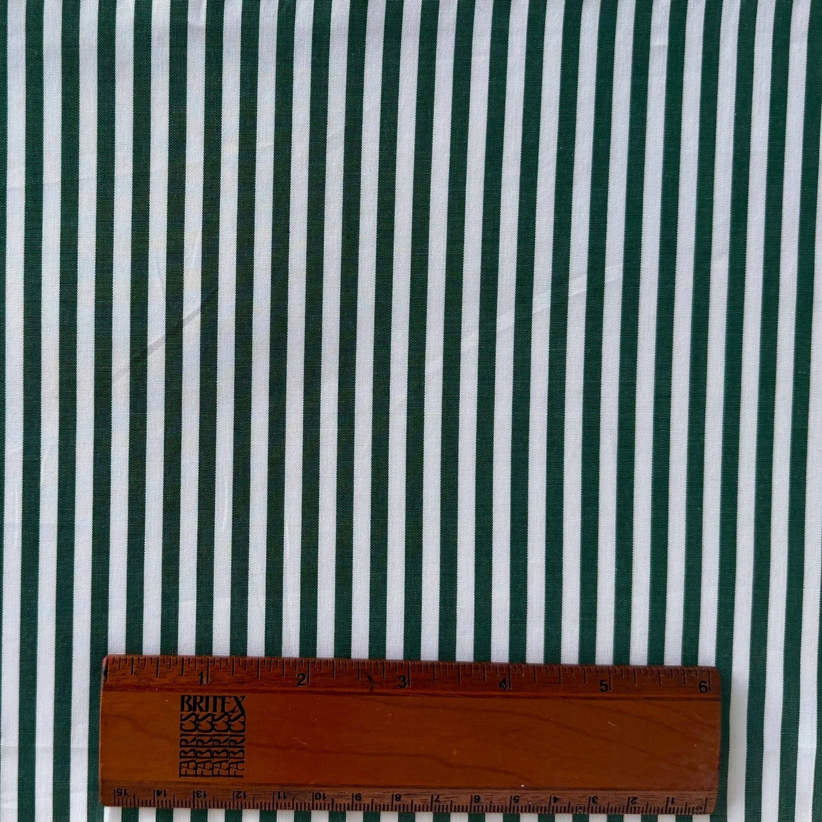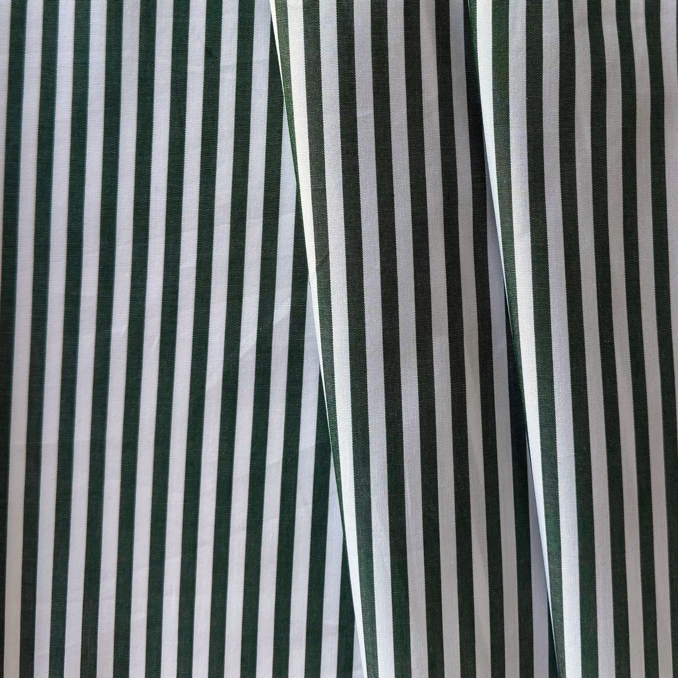 A high-end,  2-ply cotton shirting in a bottle green and white lengthwise stripe - this tightly-woven, smooth cotton is perfect for a blouse, nightwear, bed linens, or a shirt. Made in Italy. 100% cotton. 59" wide.