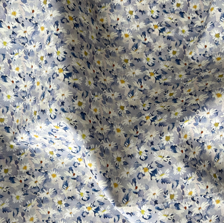 A luxurious cotton poplin from the iconic English company, Liberty of London - a tad heavier than the traditional cotton lawn, this is a crisp print featuring small daisies on a soft slate blue background.