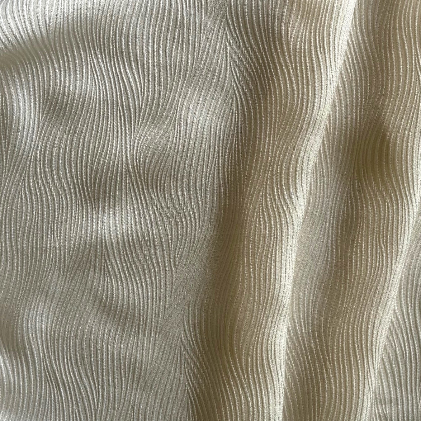 A light-weight textured silk in a shade of sand dune natural and with an undulating raised texture - this faux-pleated, drapey silk is perfect for wide-legged pants, dresses, or show-stopping blouses. Made in Italy. 100% silk. 45" wide.