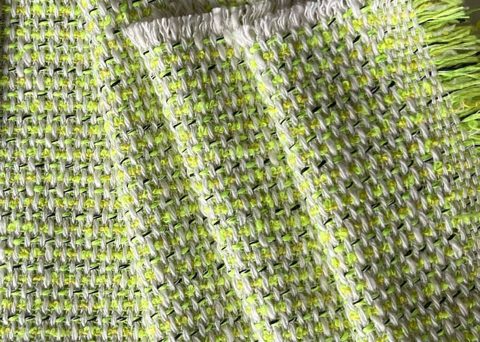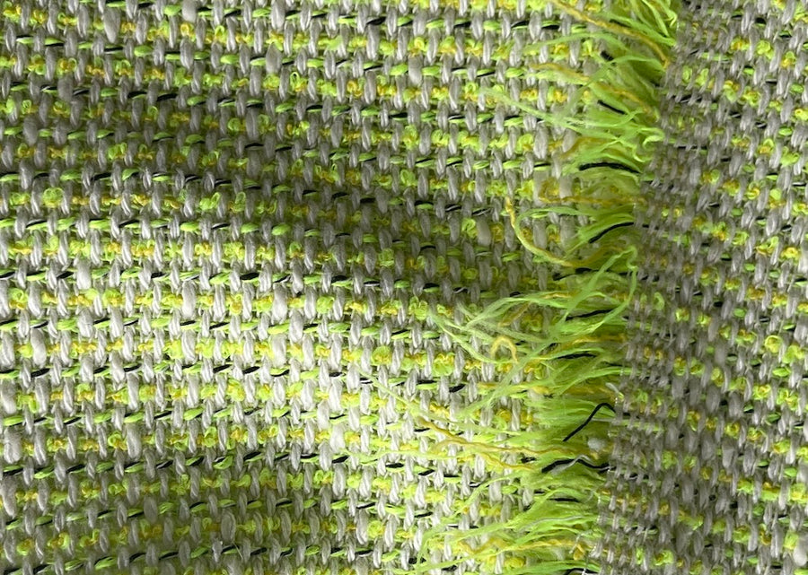 A cotton blend bouclé suiting in bright shades of neon kiwi lime, neon yellow, black, and white - this fresh suiting is perfect for a chic summer suit, a short sleeved jacket, or a summer dress. Made in Italy and used by Moschino. 80% cotton and 20% poliamide blend. 58" wide.