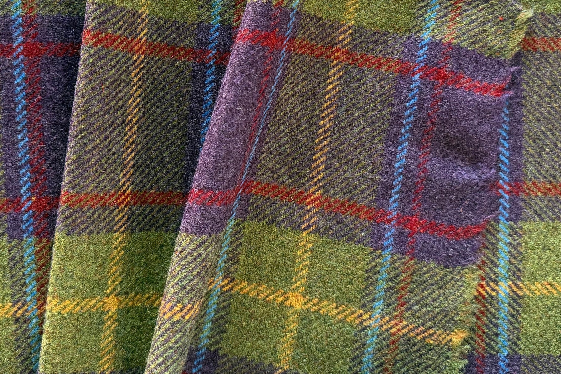 An exciting Shetland wool plaid from Ireland in moss green and plum, with sky blue, wine, and curry accents - soft and luxurious, this is the perfect weight for a vest or tailored jacket. Prized for their ability to shed water rather than absorbing it, Irish woolens have been a favorite of the outdoorsy set for centuries. Made in Ireland. 100% wool. 60" wide.