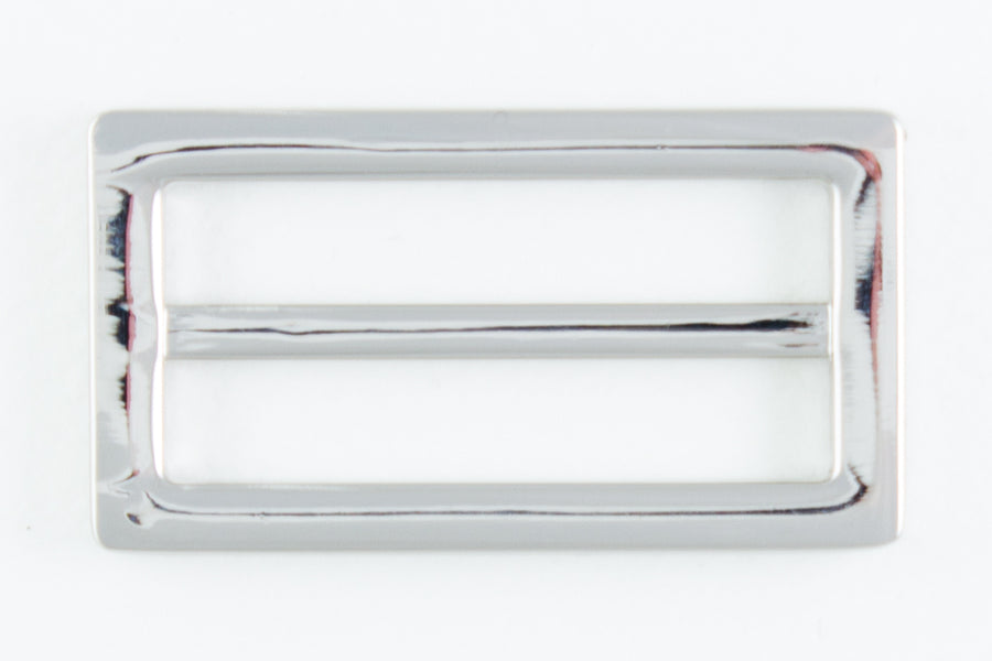 Nickel plate flat metal slider, with a double loop. Solid brass. Shiny finish. Great for handbags and purses!