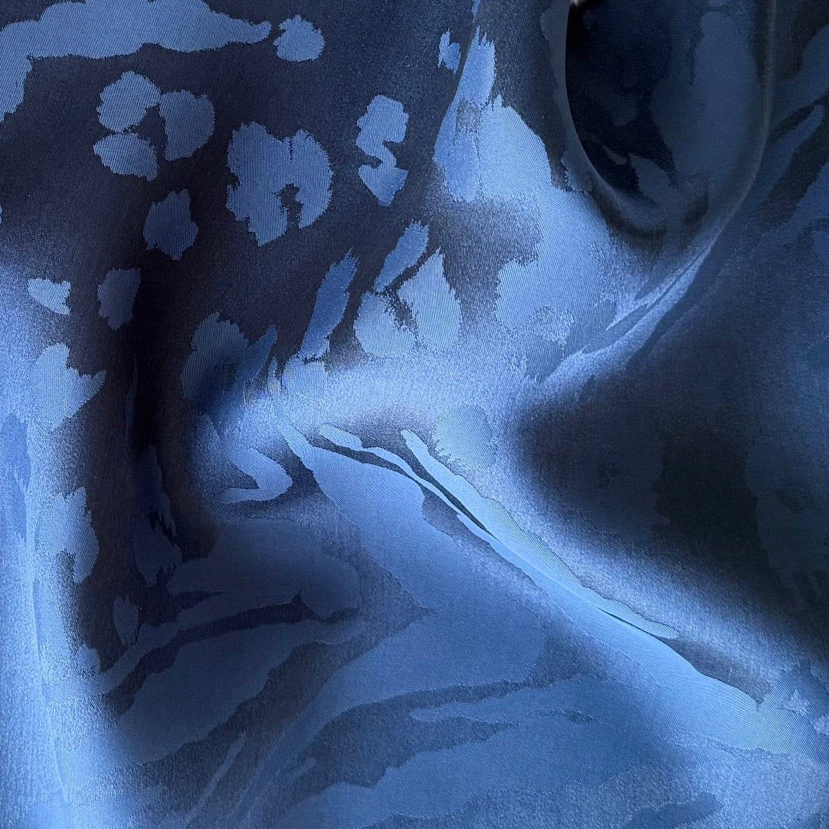 An elegant silk blend jacquard in a muted sapphire with a natural abstract pattern - this drapey silk is perfect for blouses, lingerie, or wrap tops. Made in Italy and used by Rebecca Taylor. 50% silk and 50% viscose. 52" wide.