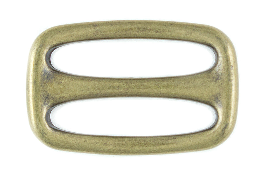 Antique brass (gold) metal slider, with a double loop. Solid brass. Matte finish and rounded corners.