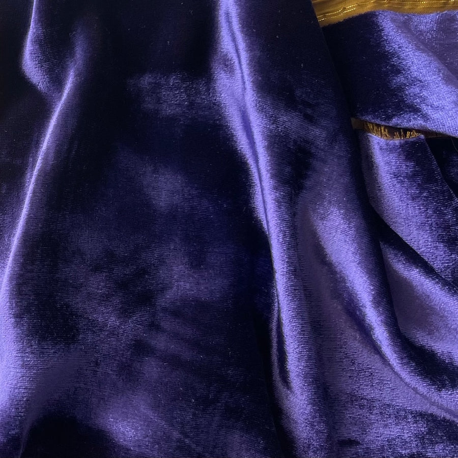 An elegant silk and rayon blend velvet in stunning royal purple and with a mustard warp -this supple, drapey velvet is perfect for jackets, special occasion wear, or romantic mid-length dresses. Made in China. 80% rayon and 20% silk. 54" wide.