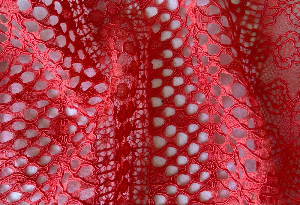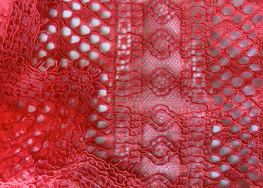 A rayon blend corded lace fabric of crosswise lacy stripes in saturated coral rouge and with graceful scallops on both selvedges - this delicate lace fabric is perfect for a stunning bathing suit cover-up, an over-top, or a romantically alluring maxi-dress. Rayon embroidery with a nylon base. 58" wide.
