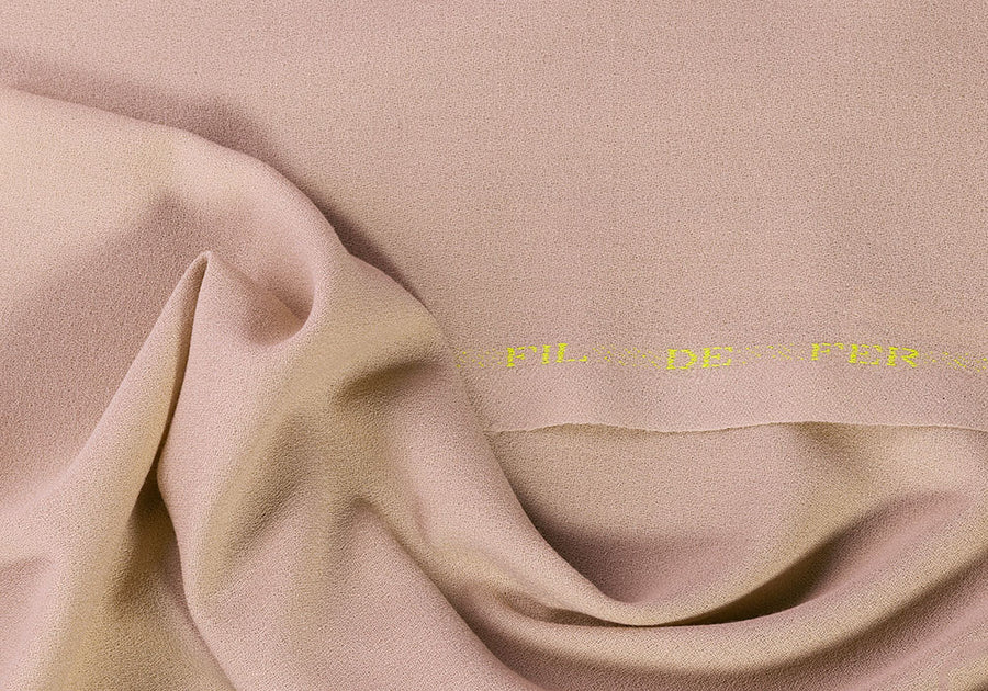A selvedged wool crepe in rosey beige. Pliable and soft, this wool is perfect for flat-front slacks or an elegant suit. Made in Italy. 100% wool. 59" wide.