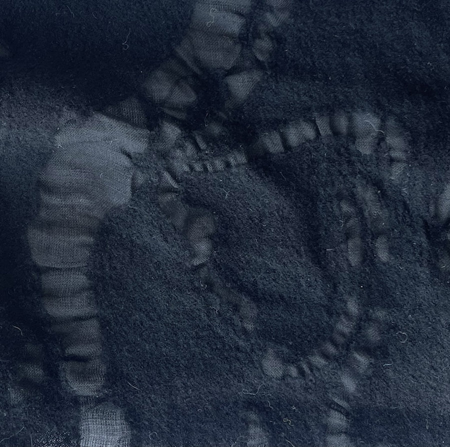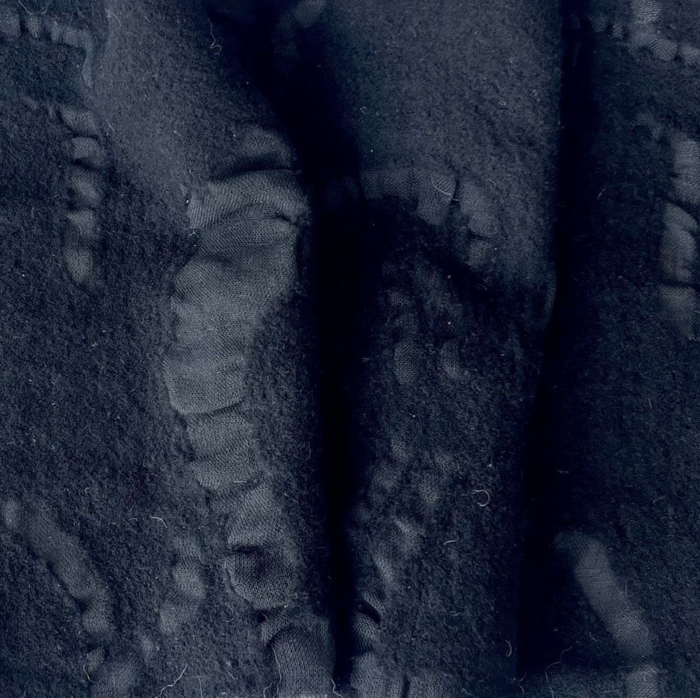 A sophisticated and unique felted boiled wool with felted abstractions on top of semi-sheer black voile backing - perfect for a stunning top, an unlined jacket, or a delicious wrap. 100% wool. 62" wide.