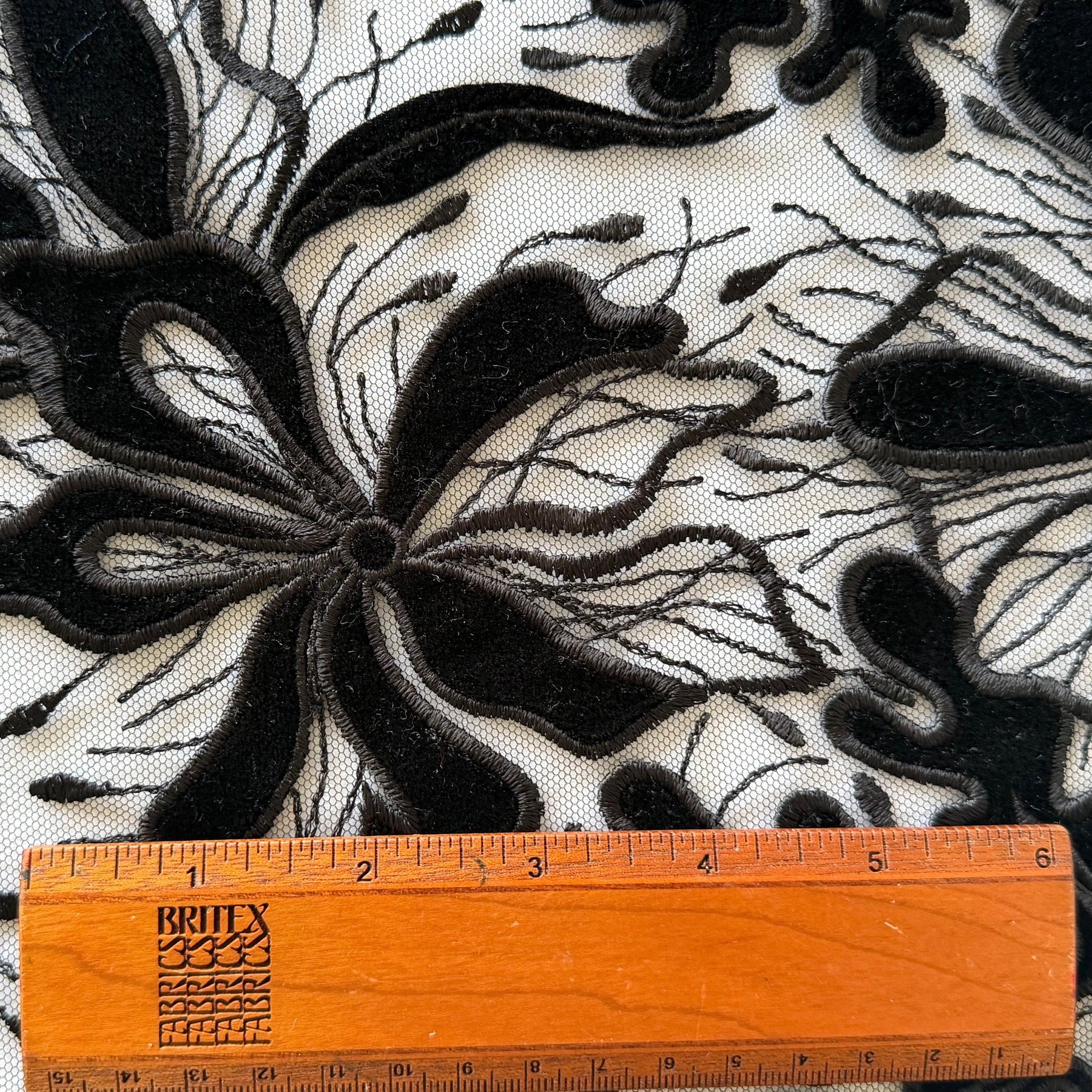 A onyx black nylon tulle covered in black velvet lilies with graceful stamens and leaves - this chic fabric is perfect for tunics, wraps, or party dresses. Limited yardage. Made in Korea. 50% nylon and 50% polyester. 52" wide.